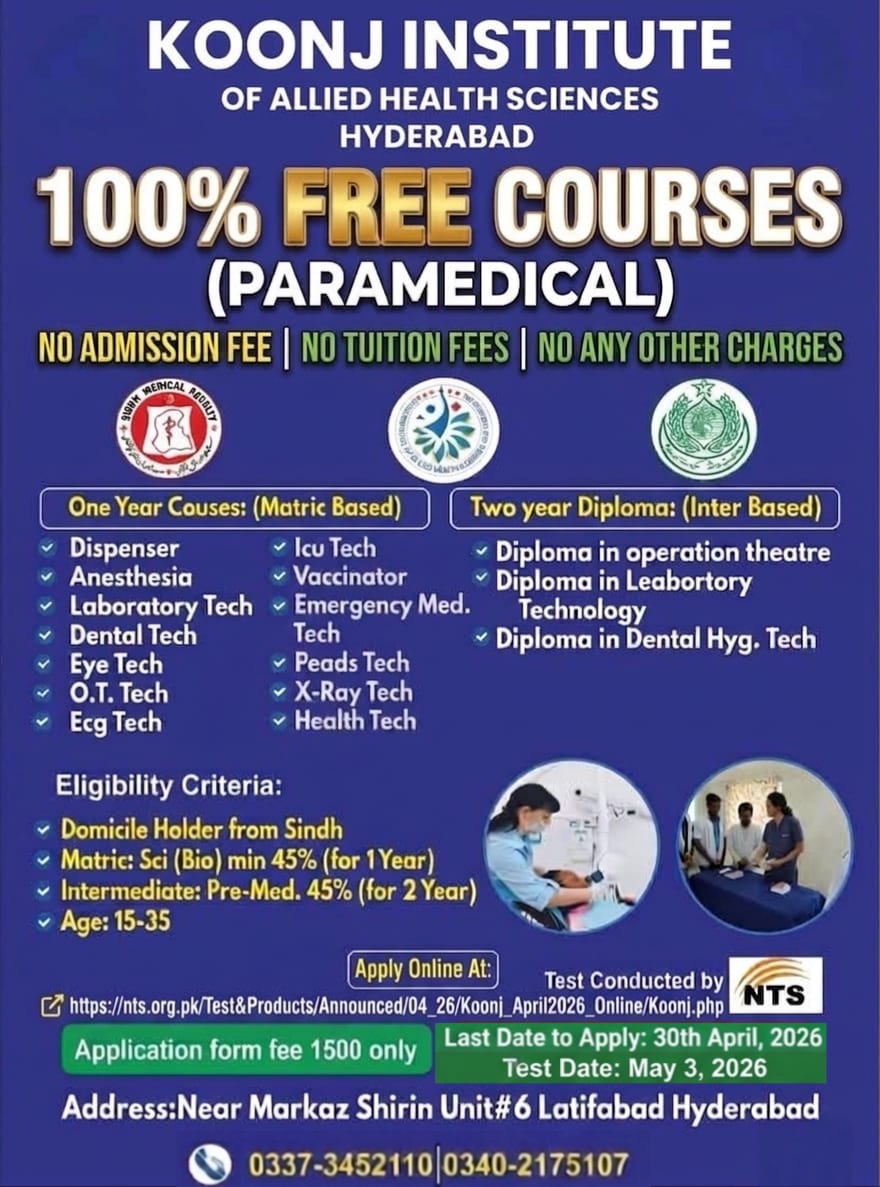 Location: Latifabad/Qasimabad area, Hyderabad, Sindh. (Search "Koonj Institute Hyderabad" on Google Maps for the exact campus location).